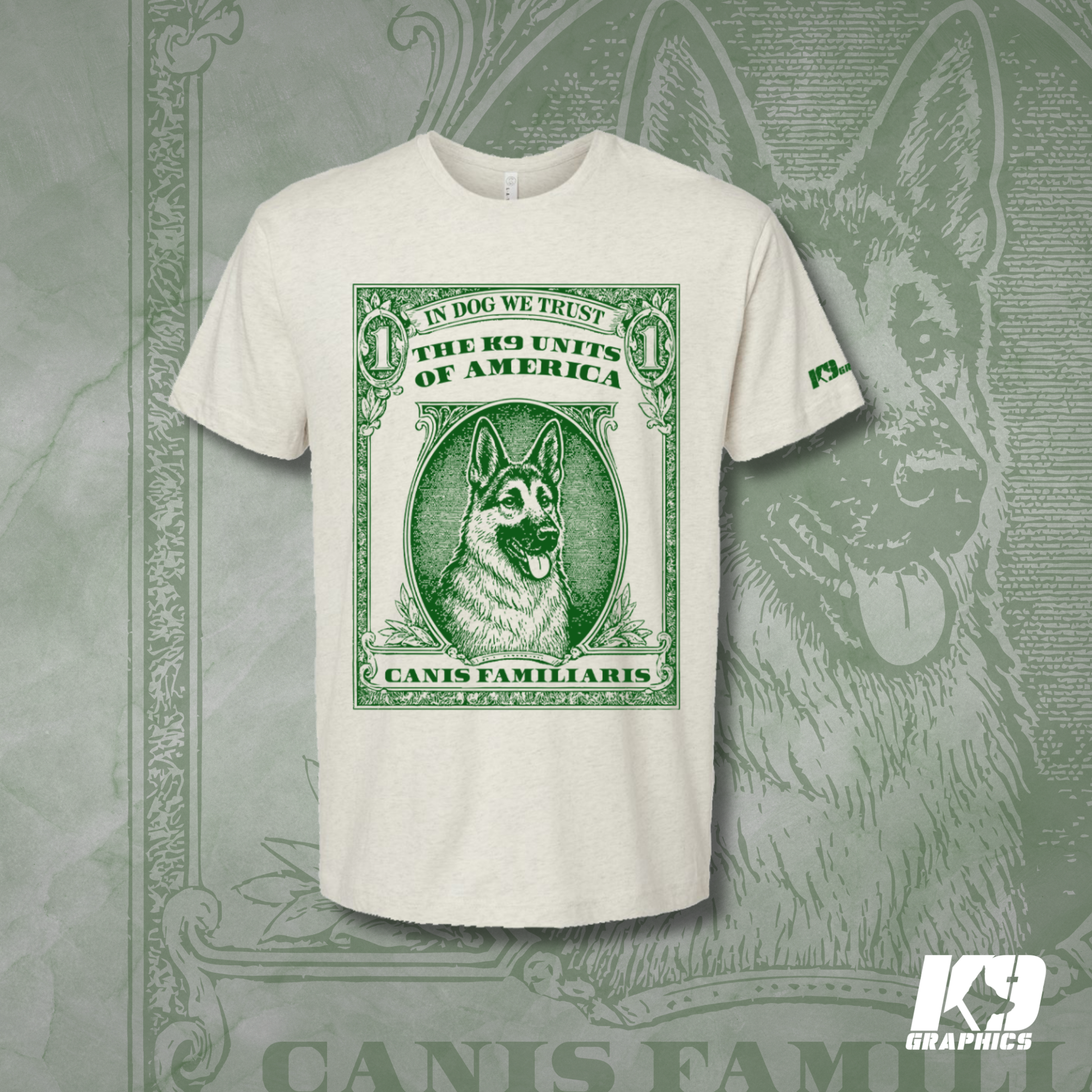 This heather natural L.A.T. tee features a bold green screen print of a German Shepherd dollar bill design with “K9 Units of America” front and center. Finished with the K9 Graphics sleeve logo, it’s soft, durable, and built for those who back the badge and the paw.